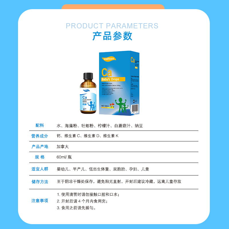 Wellborn威尔邦婴幼儿童钙液体维生素海藻钙加拿大进口60ml 瓶