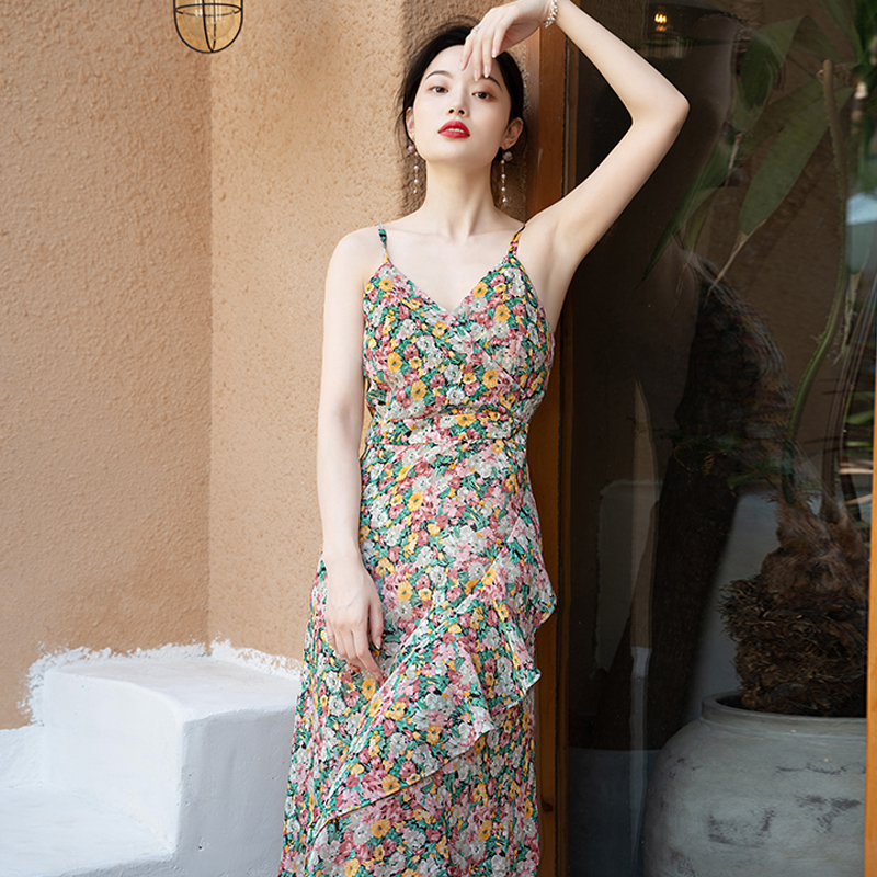 2025新春夏款 碎花雪纺连衣裙吊带甜美茶歇内搭显瘦三亚沙滩度假裙