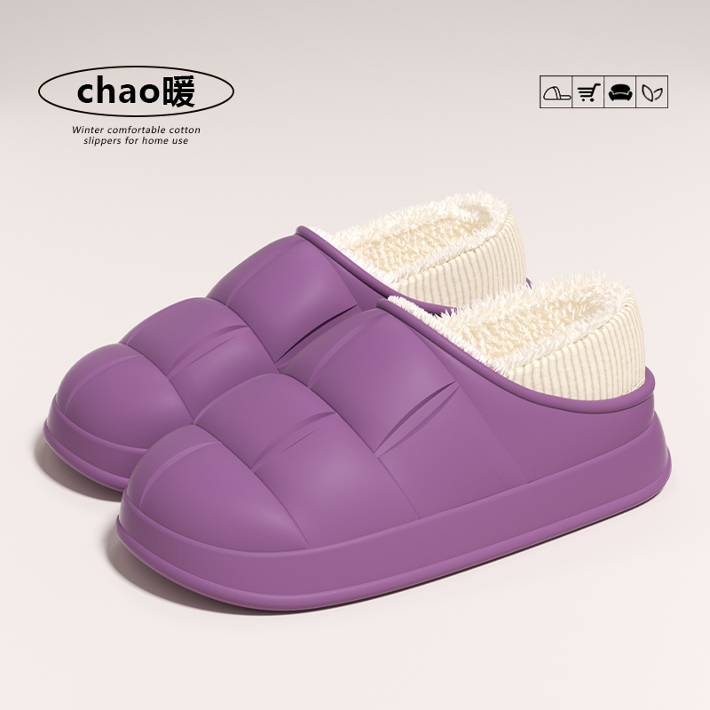 保暖毛绒家居防滑室内外穿包跟PU棉鞋 防水大码 秋冬季 男士 女 棉拖鞋
