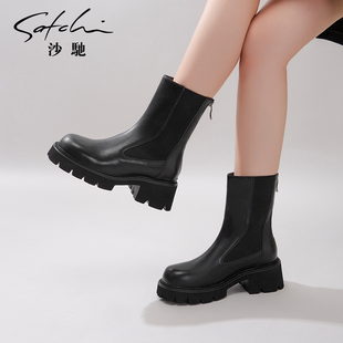 百丽切尔西靴女靴冬季 保暖英伦风厚底短靴加绒烟筒靴子X2G2DDD3