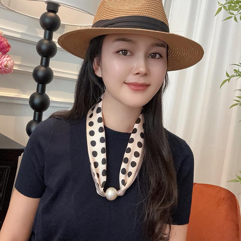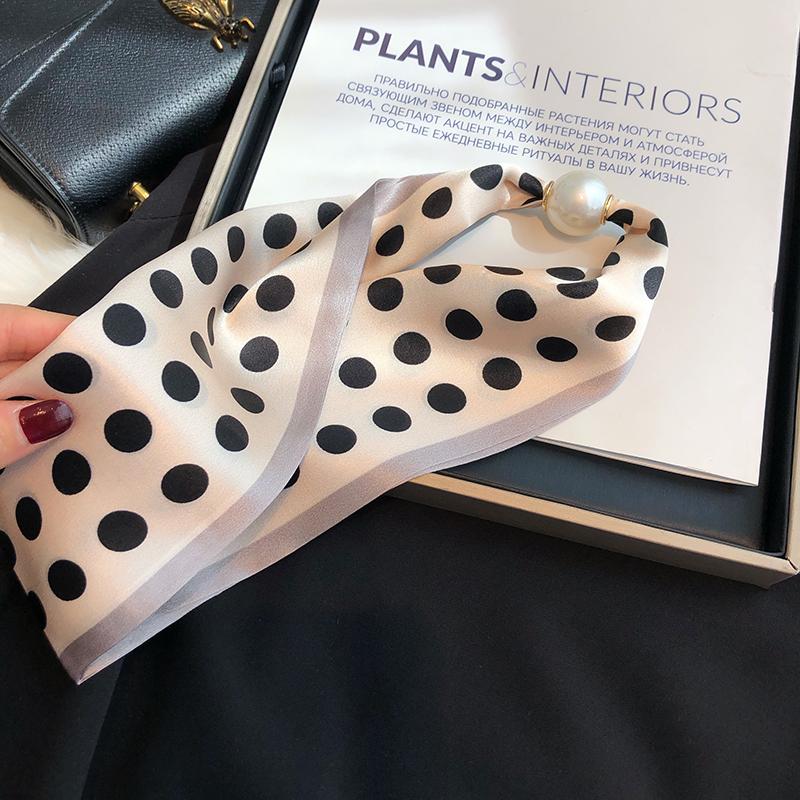 真丝丝巾2025新款 珍珠项链吊坠百搭波点米色100%桑蚕丝懒人小领巾