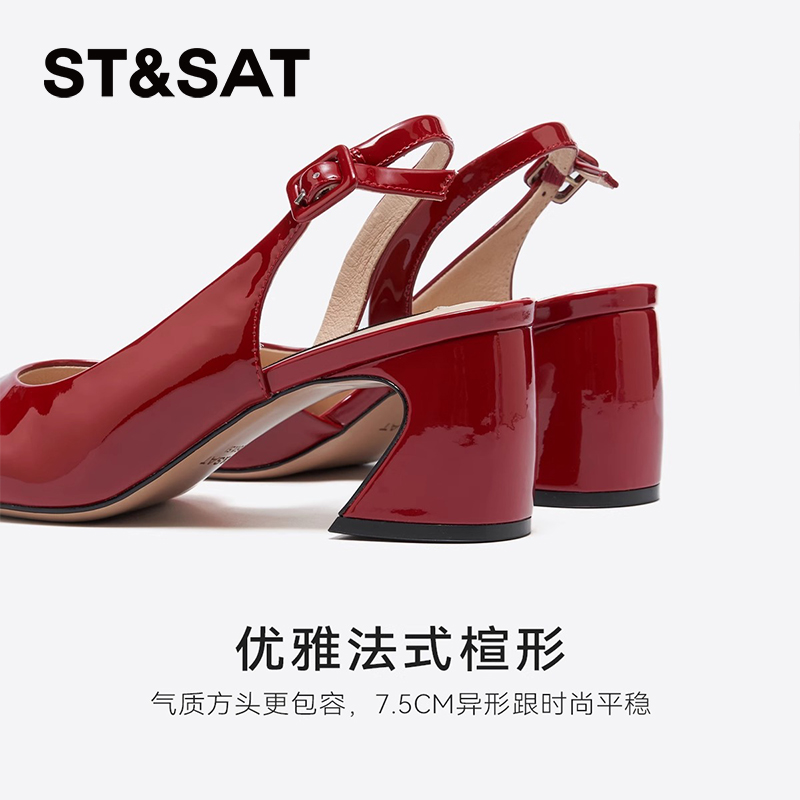 气质方头粗跟玛丽珍后空凉鞋 星期六红色高跟鞋 法式 新款 女2025春季