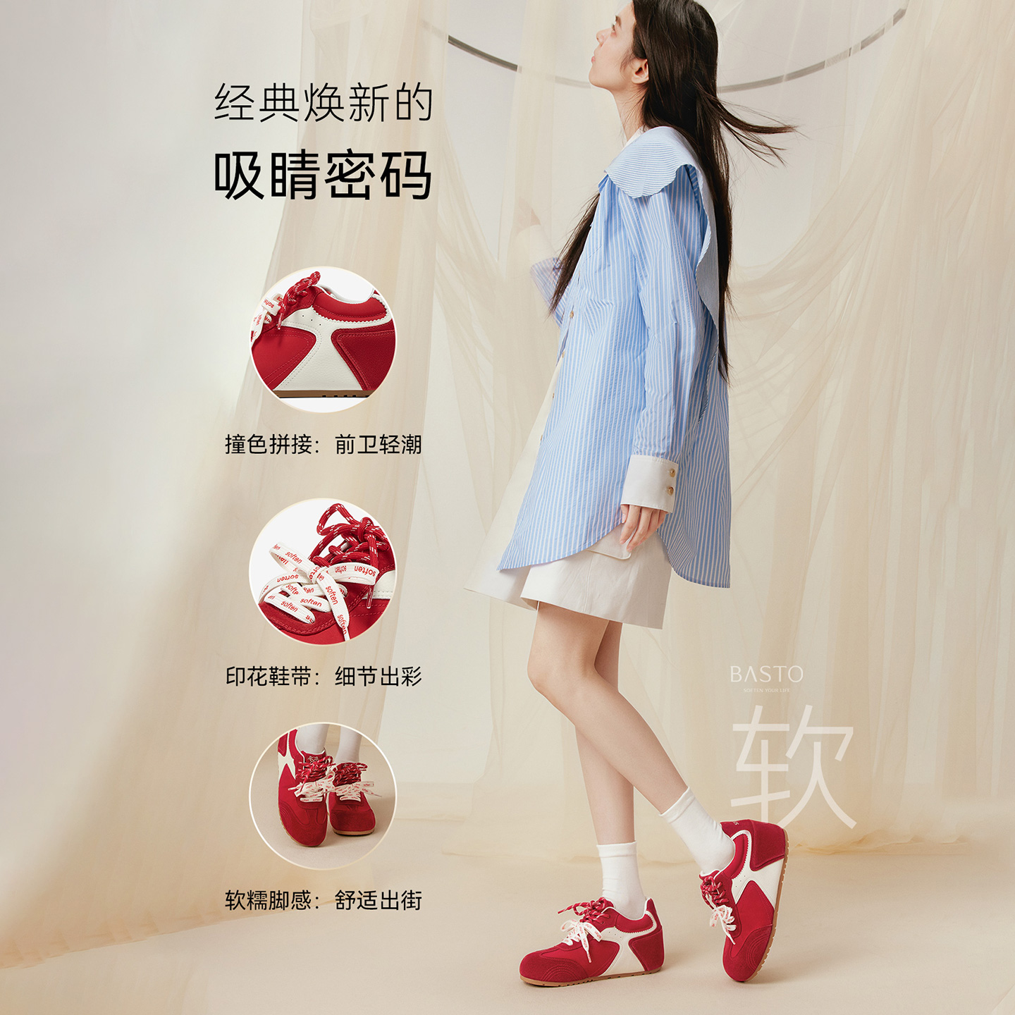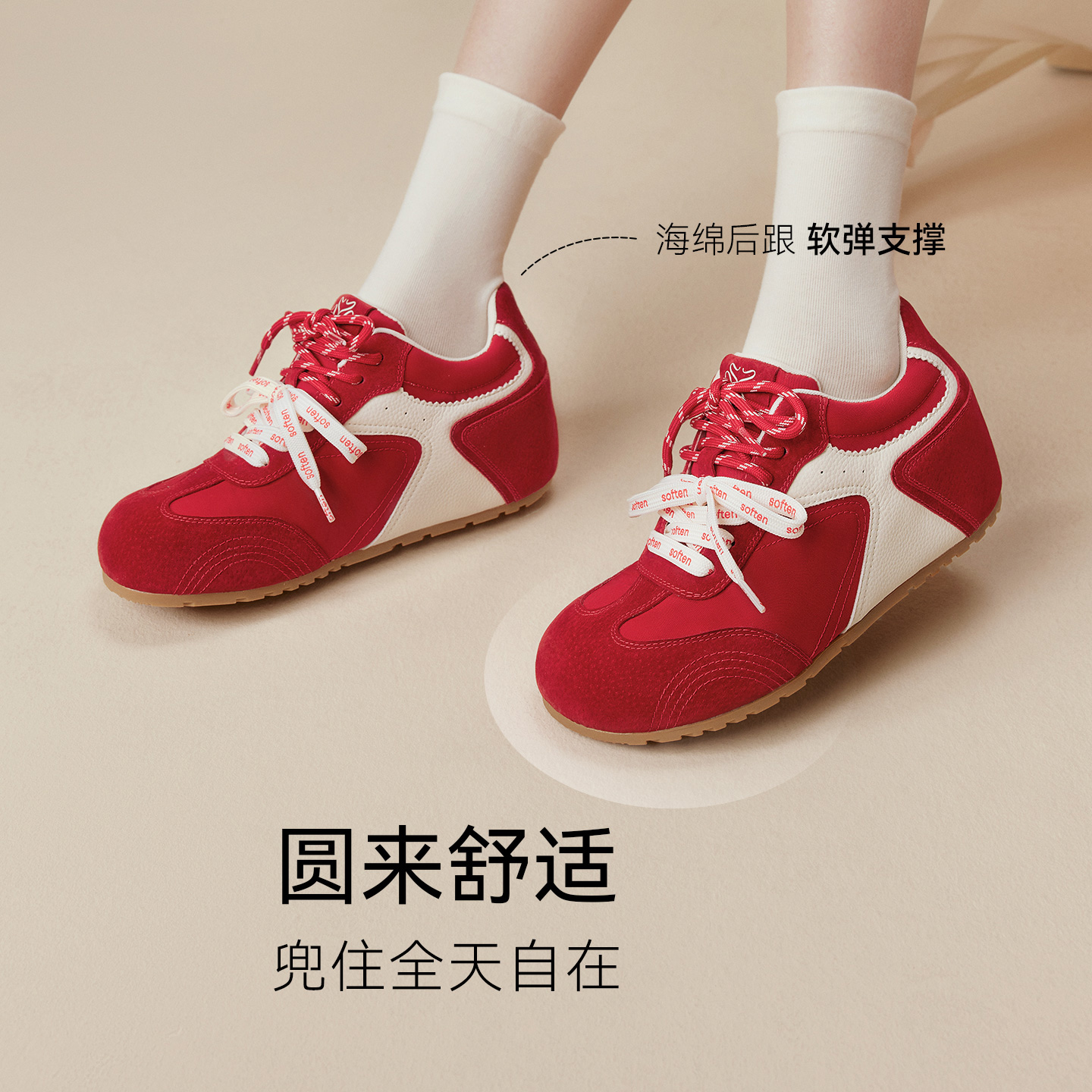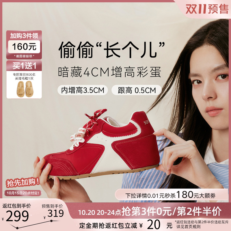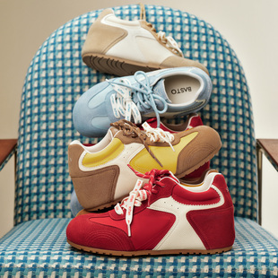 红色运动休闲阿甘鞋 德训鞋 百思图小彩糖25秋新款 女 张予曦同款
