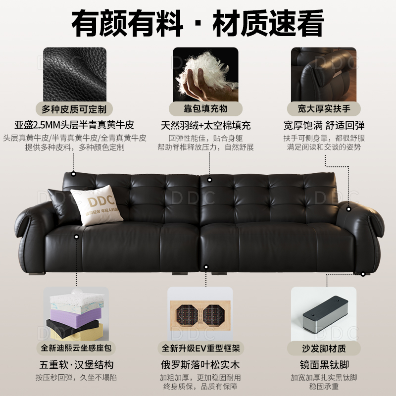 DDC意式 极简天鹅全青皮真皮沙发小户型客厅中古风黑色皮沙发新款