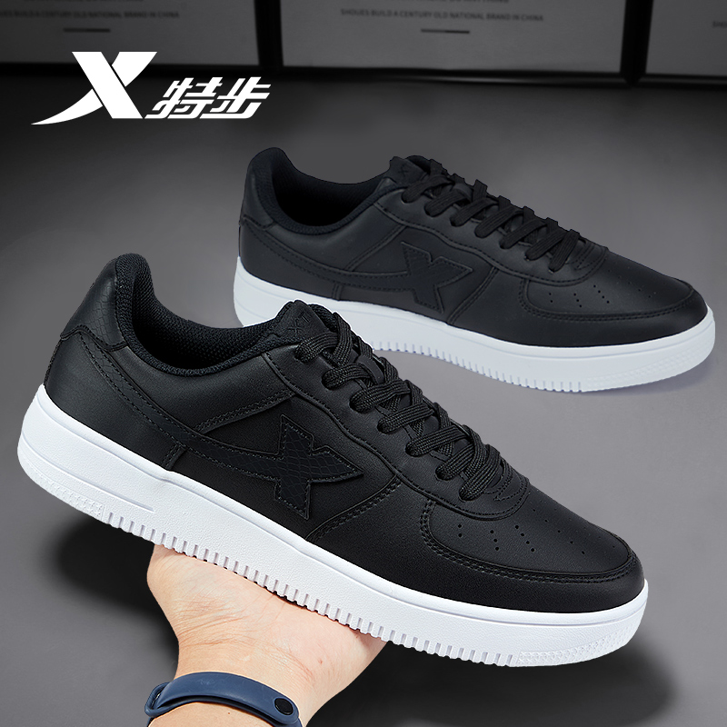 低帮板鞋 小白鞋 黑色休闲鞋 皮面防水运动鞋 特步男鞋 男夏季 2025新款