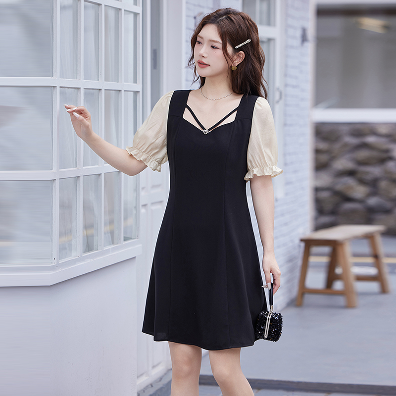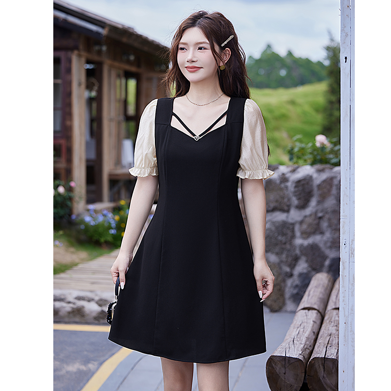 新款 夏装 气质假两件显瘦胖妹妹连衣裙收腰A字小黑裙 女装 绮娑大码