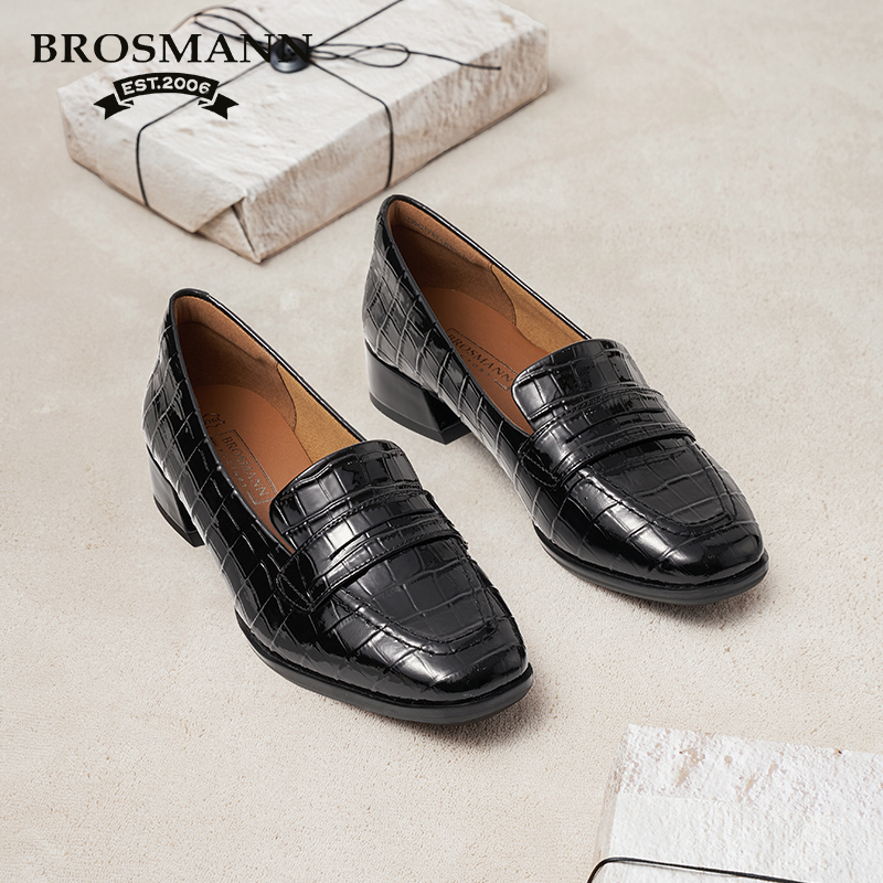 女款 单鞋 2025新款 浅口镜面鳄鱼纹粗跟女鞋 黑色秋季 宝舒曼真乐福鞋