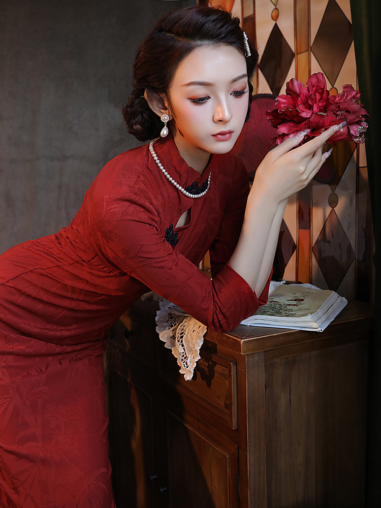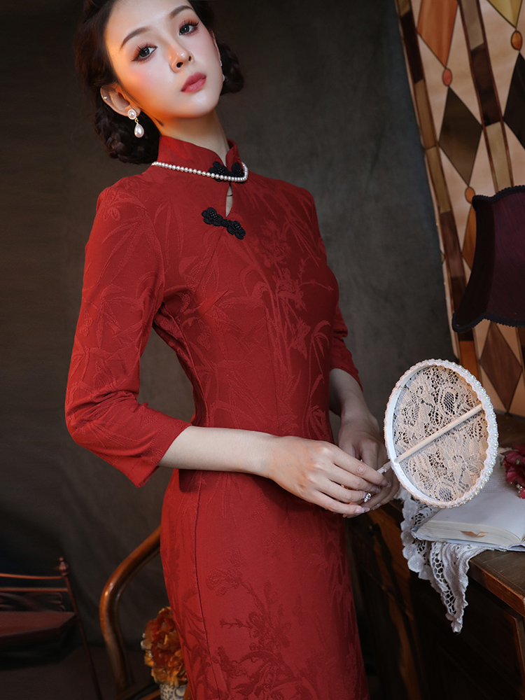 婚礼婆婆旗袍复古长款 旗袍 酒红色醋酸缎提花传统婚礼妈妈婚宴秋季