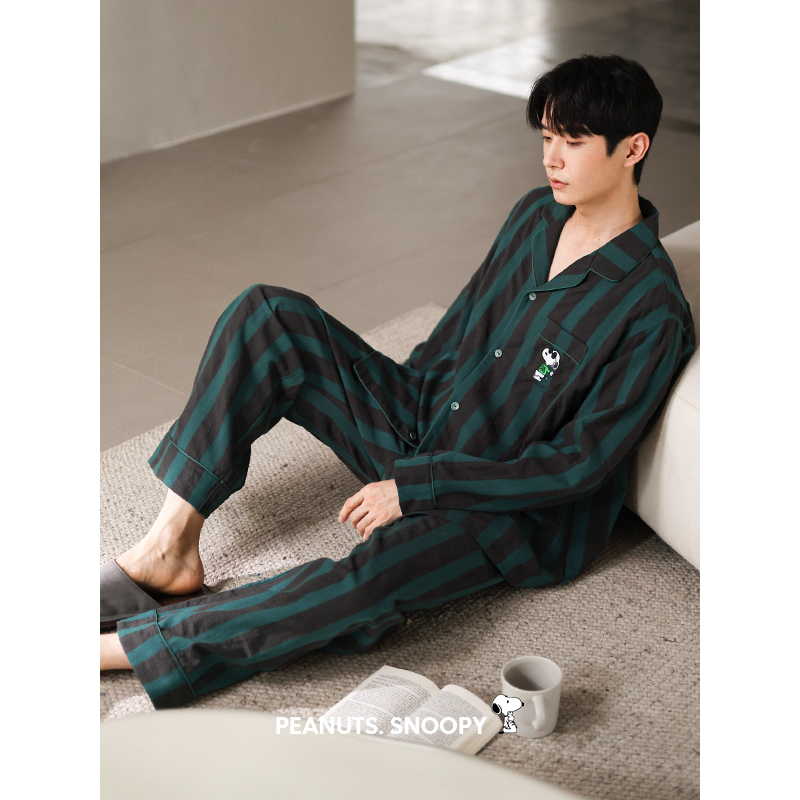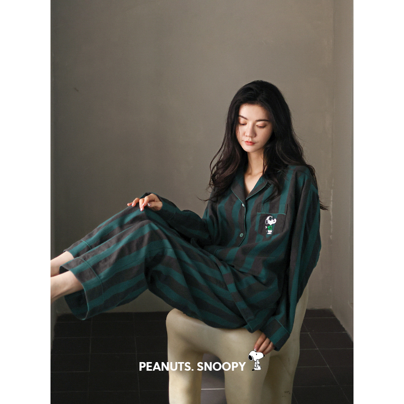 春秋套装 贝妍情侣睡衣女秋季 开衫 柔软棉条纹家居服史努比男士 新款