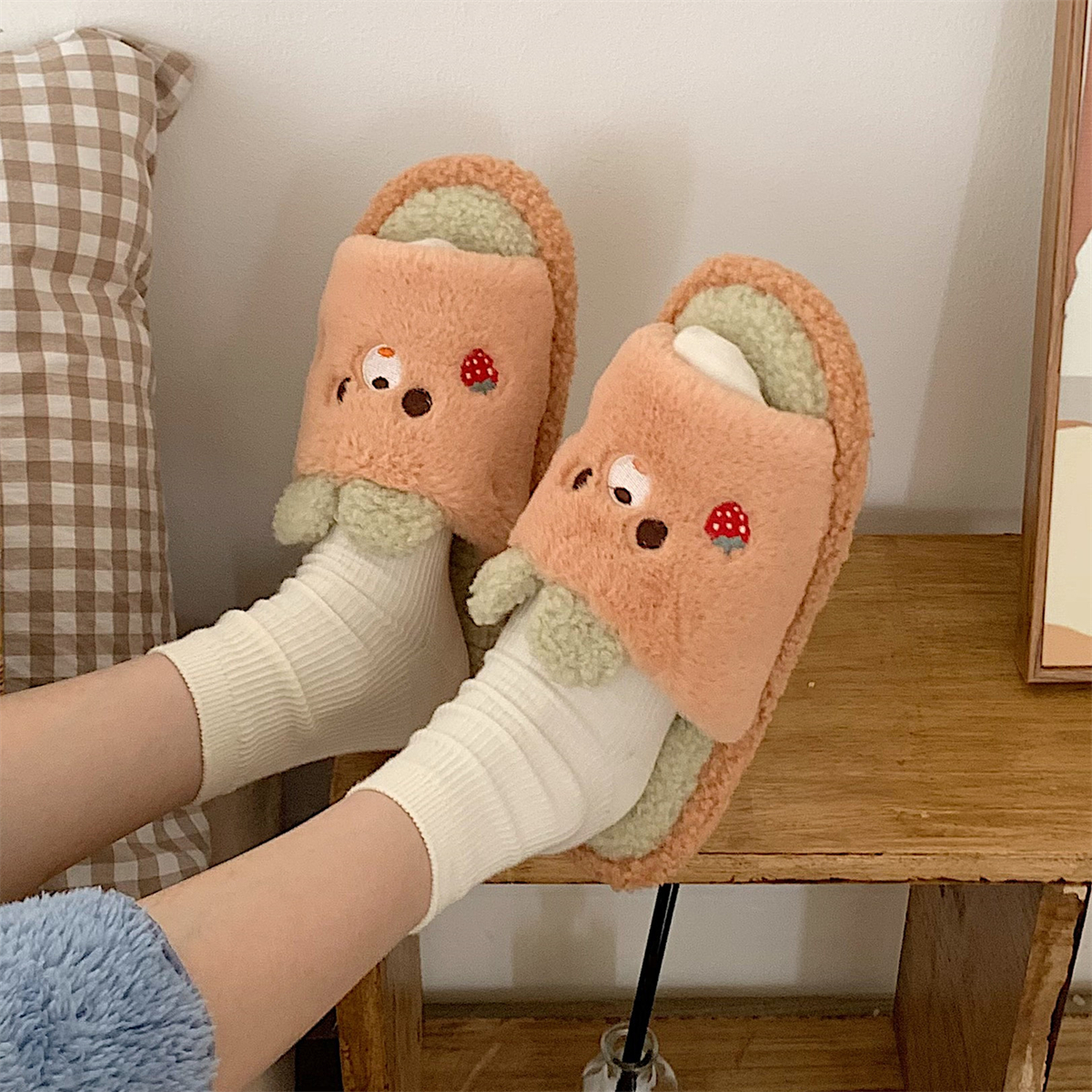 卡通可爱居家室内用保暖一字毛绒拖女冬季 学生防滑软底静音棉拖鞋