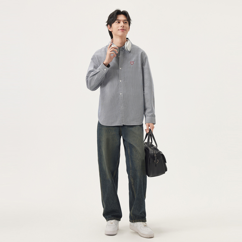 衬衫 纯棉浅蓝色竖条纹长袖 男潮流宽松休闲痞帅衬衣 2025秋季 WAJ