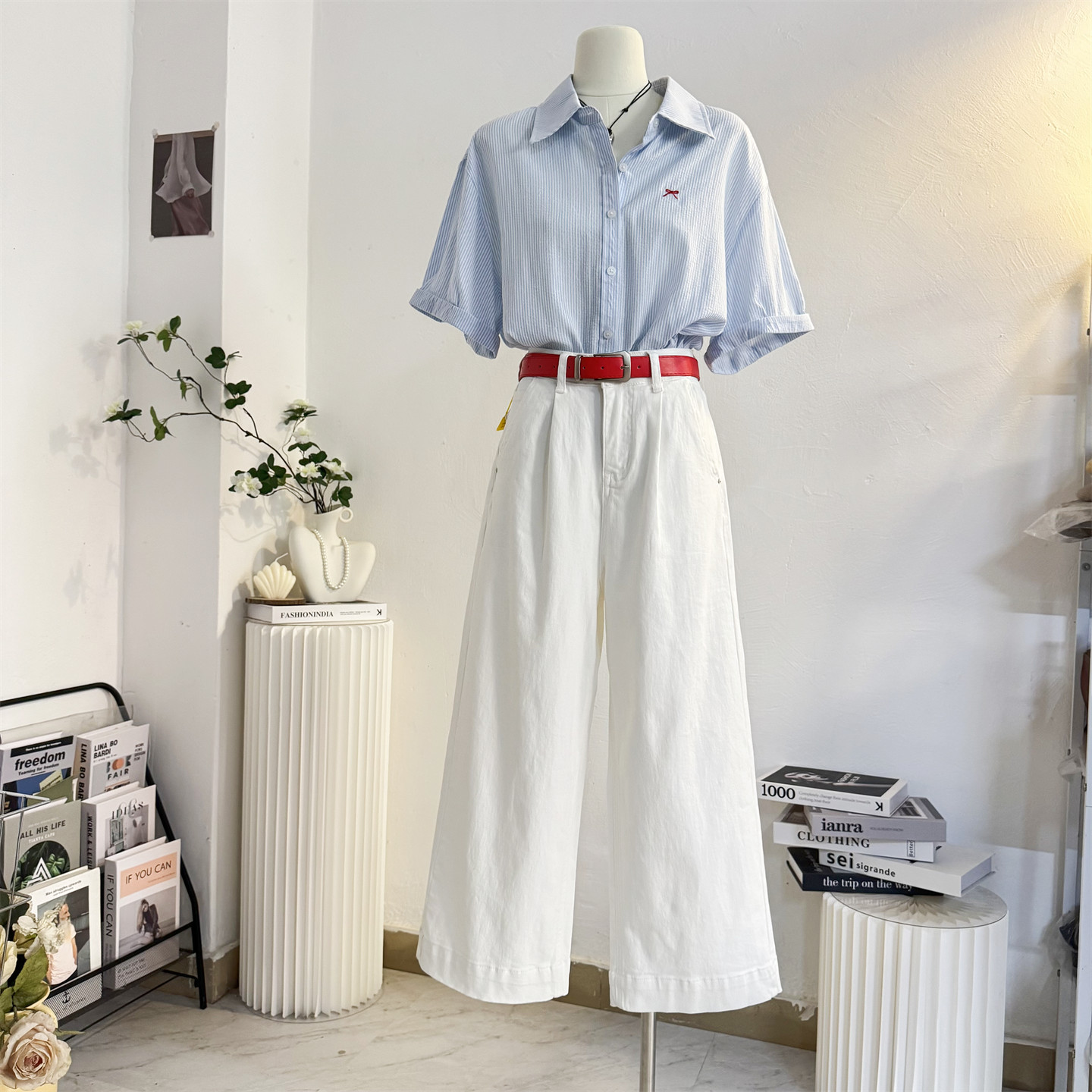 白色九分阔腿牛仔裤 宽松高腰直筒八分小个子配腰带 女2025夏薄款
