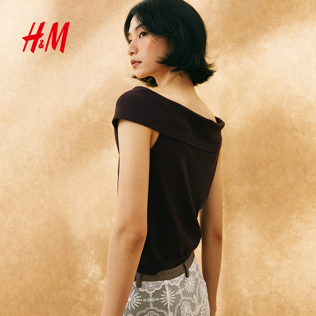 毛针织衫 上衣毛衫 2025秋季 垂褶露肩青果领无袖 1306286 新款 HM女装
