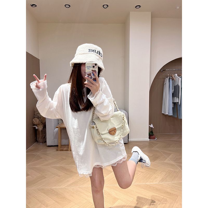 圆领宽松白色T恤上衣女 蕾丝拼接中长款 纯棉春秋季 单穿内搭打底衫