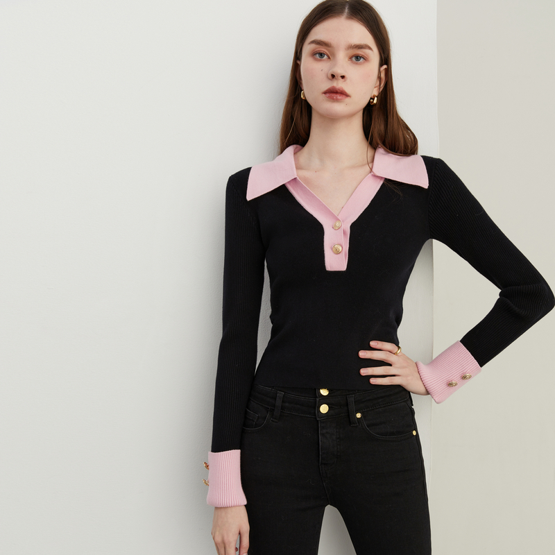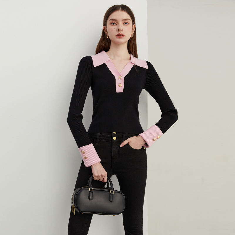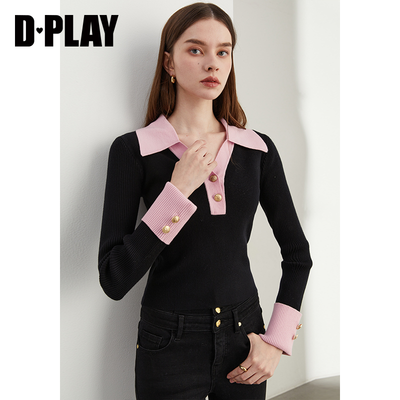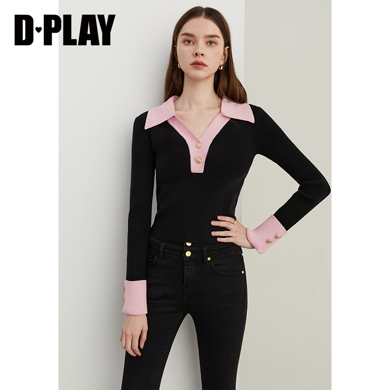 高级感内搭打底衫 黑色拼粉色针织衫 毛衣上衣女 法式 DPLAY2025秋季