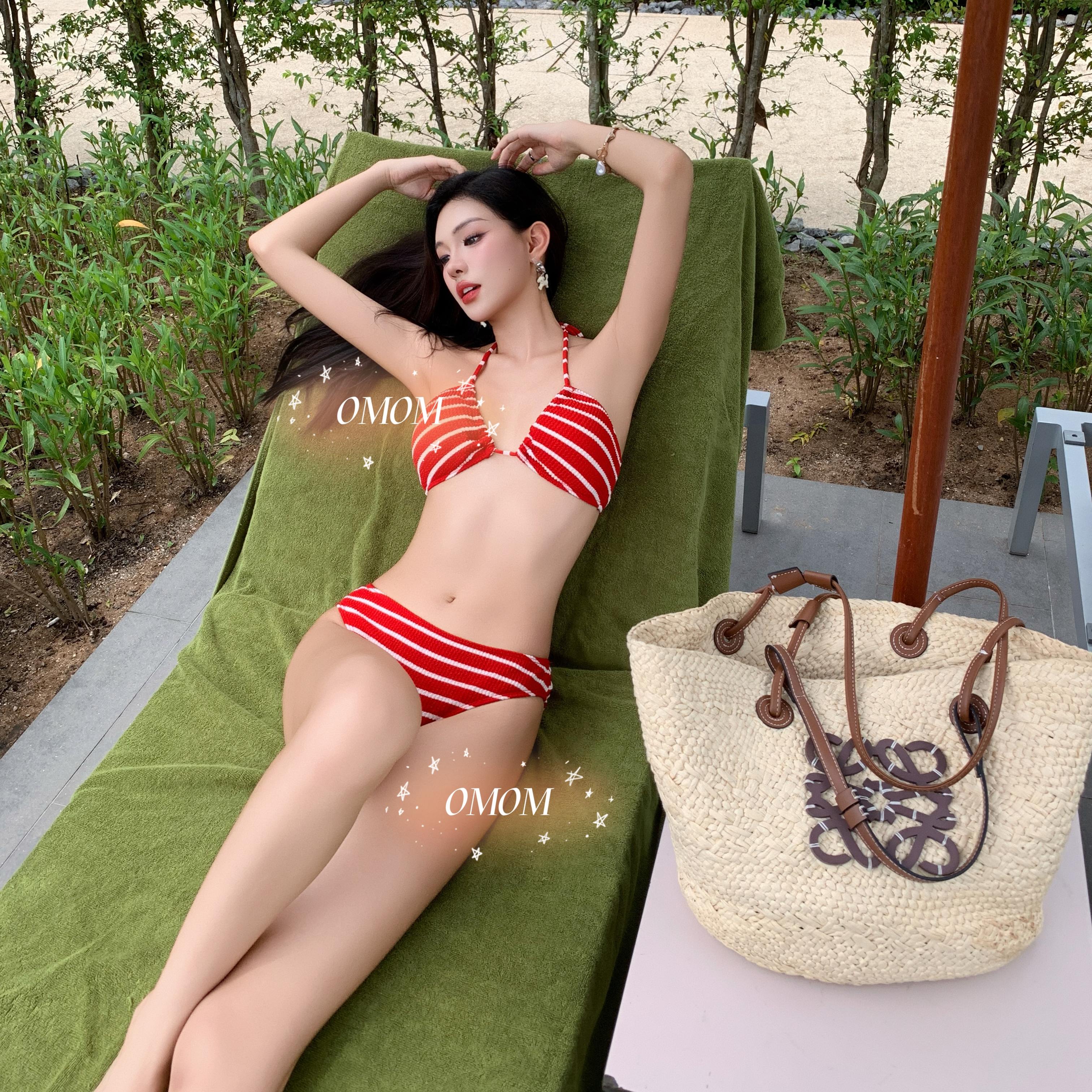 omom2025夏季 复古条纹比基尼三件套性感分体沙滩度假温泉泳衣 新款