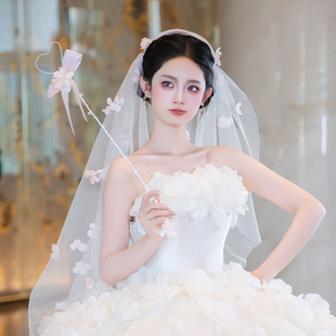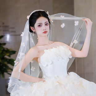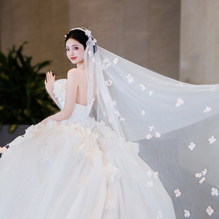 新娘复古拖尾白色花朵头饰婚纱长款 超仙飘逸抹胸公主旅拍配饰 法式