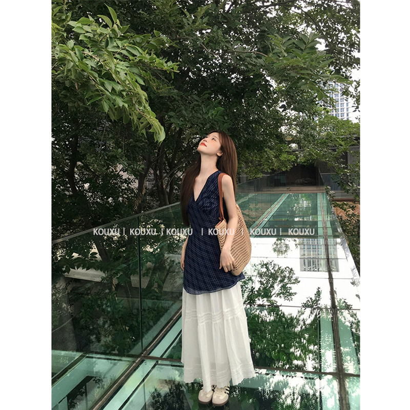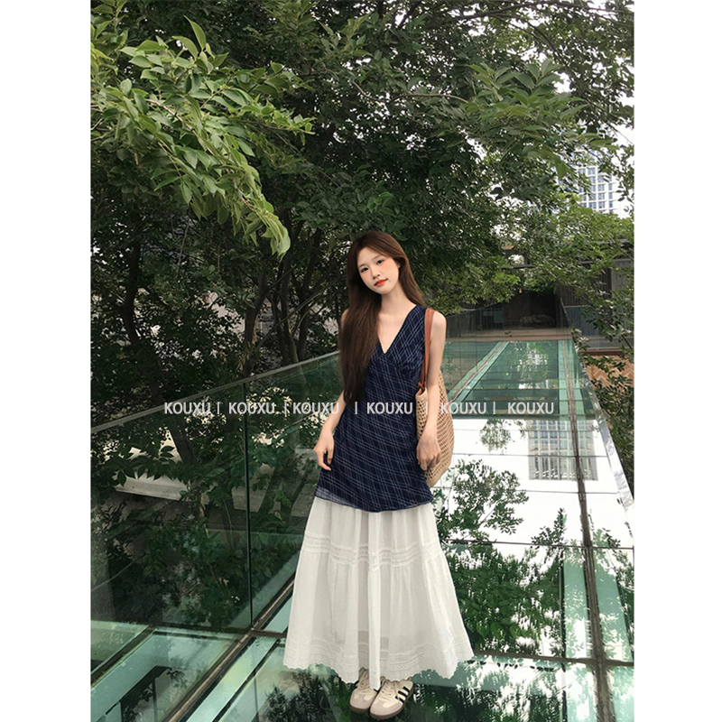 夏天氛围小裙子百搭显瘦格纹V领背心无袖 上衣花边白色半身裙套装