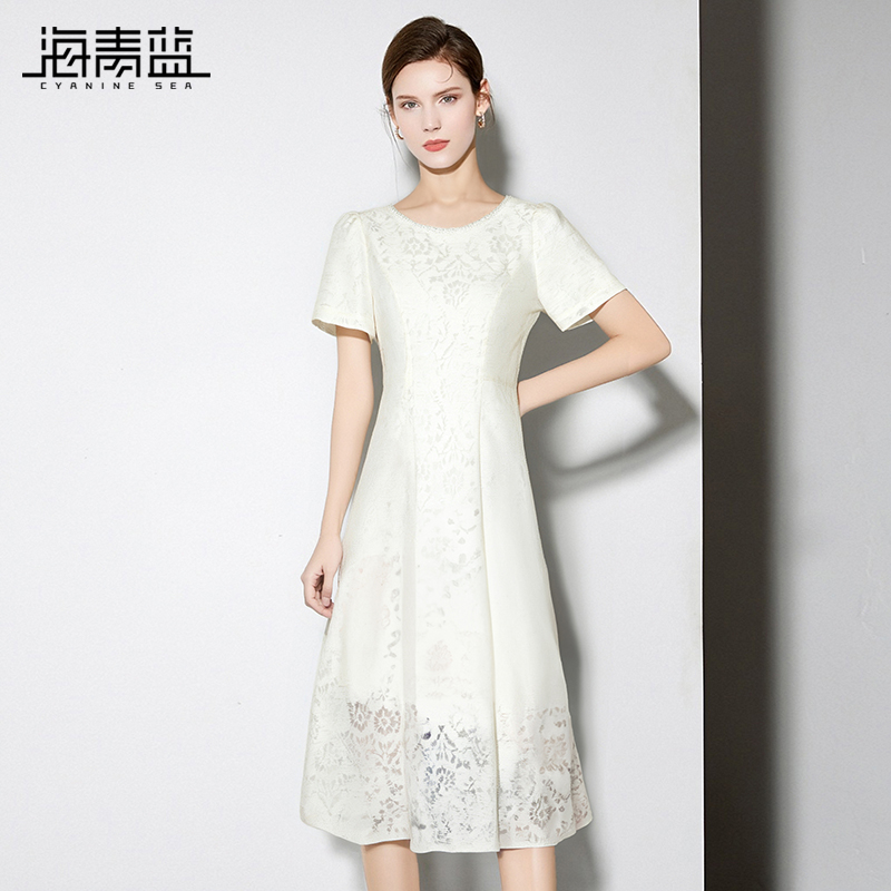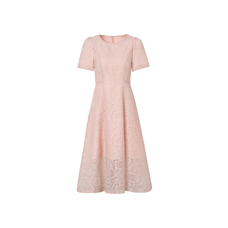 粉色中长款 高级女装 印花蕾丝圆领裙子 连衣裙夏女2025新款 海青蓝