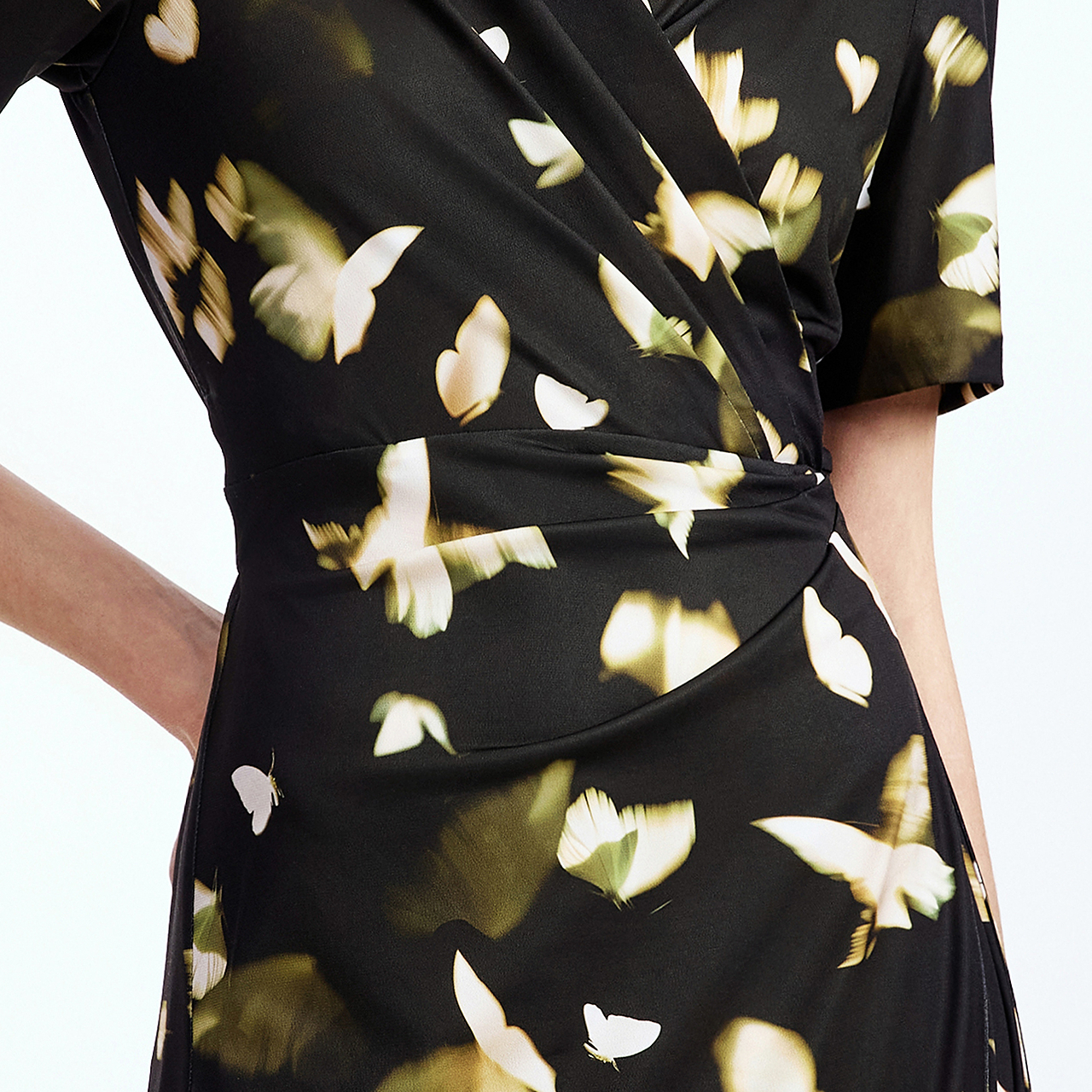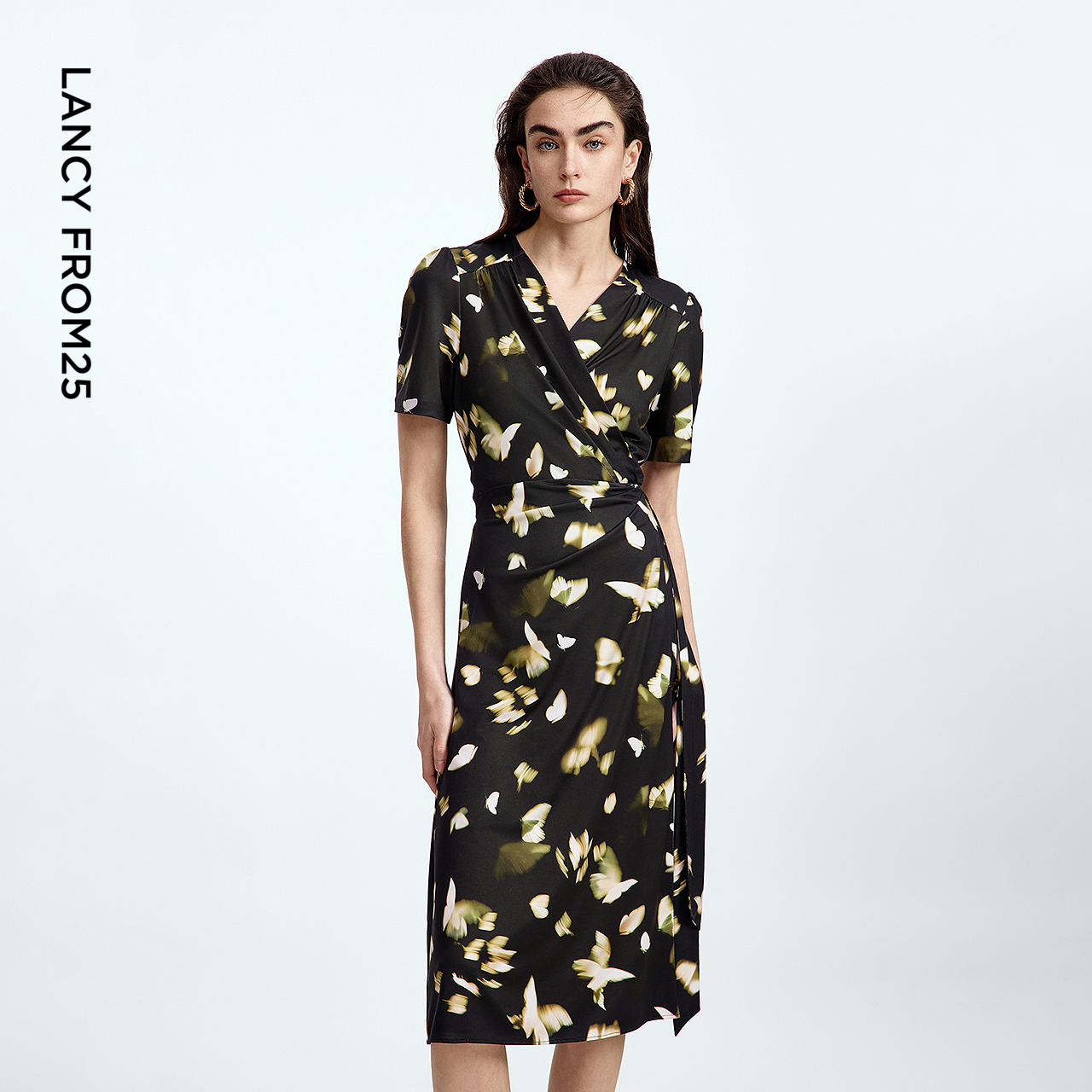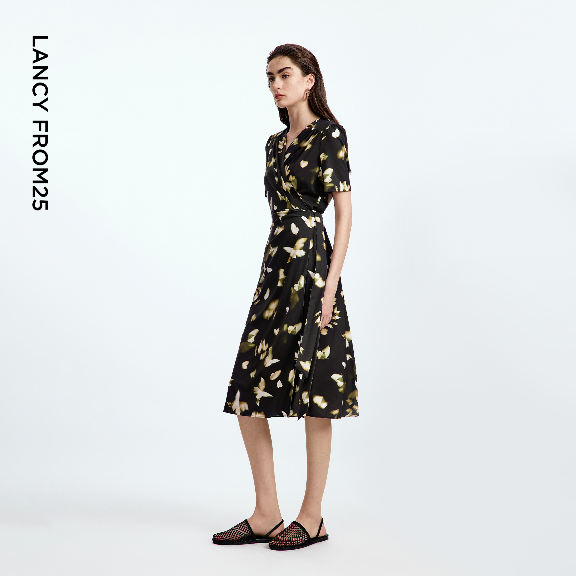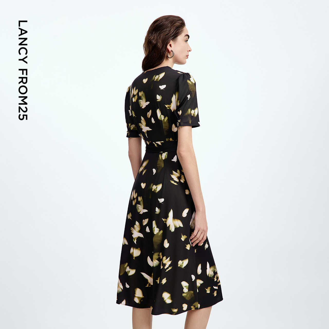 SNIDEL2025秋冬新品 收腰蝴蝶结印花连衣裙SWFO254025 优雅V领短袖