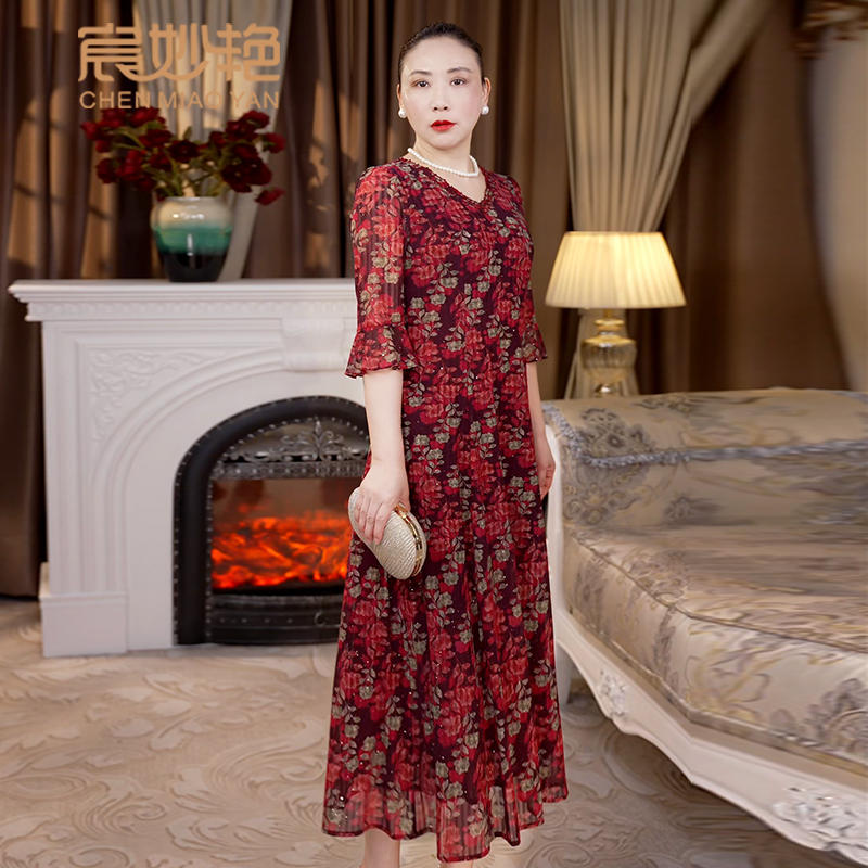 优雅气质高档弹力台湾纱大码 连衣裙收腰显瘦洋气碎花裙 妈妈装