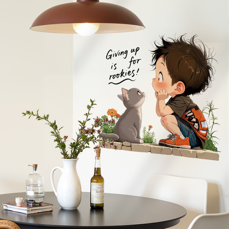 卡通可爱男孩猫咪英文字墙壁贴纸自粘童趣儿童卧室墙壁纸装 饰贴画