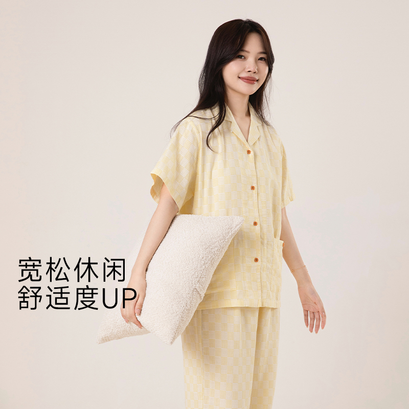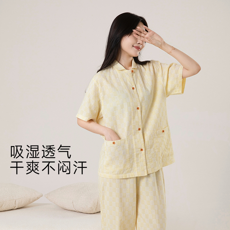 格子可外穿情侣家居套装 经典 女全棉双层纱睡衣春夏短袖 宜色家正品