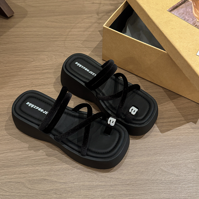 细带海边度假凉鞋 黑色水钻厚底增高套趾凉拖鞋 女夏外穿2025新款
