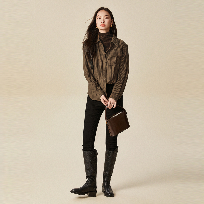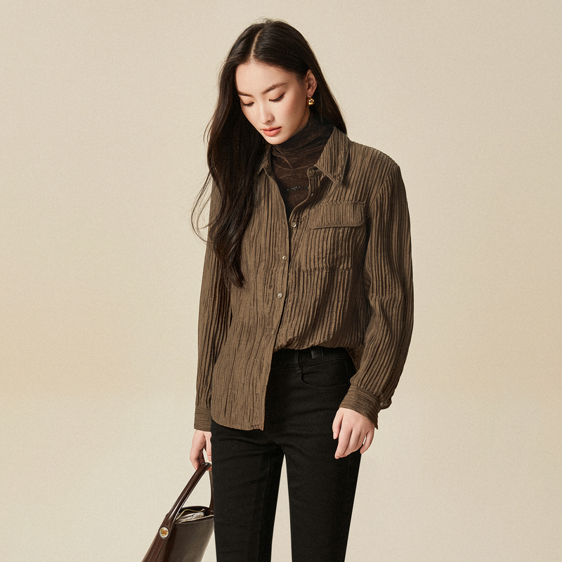 新款 XG雪歌通勤简约长袖 冬季 时尚 深咖色莱赛尔褶皱上衣女 翻领衬衫
