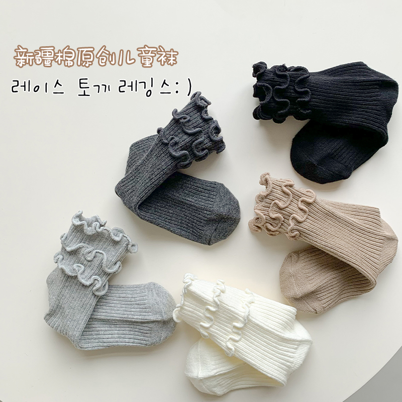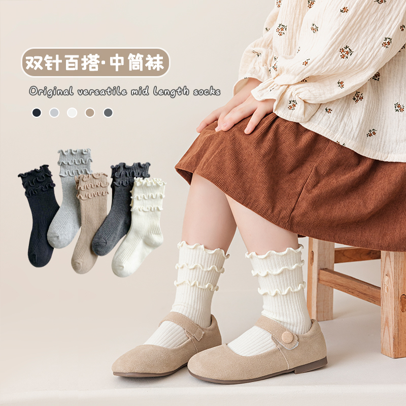 女童袜子春秋纯棉儿童韩版 三层木耳花边堆堆袜女孩白色咖色中筒袜