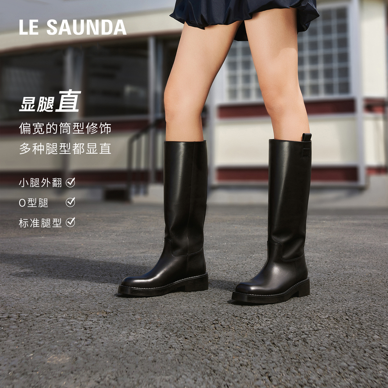 48003 真皮圆头粗跟骑士长筒靴子女鞋 莱尔斯丹秋冬新款 黑色时尚