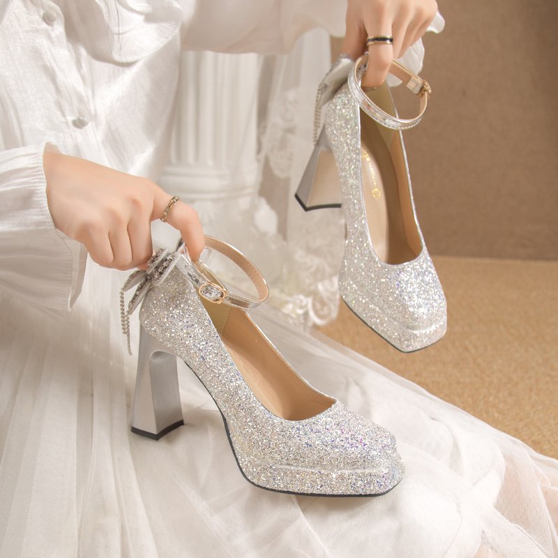 防水台水钻流苏蝴蝶结粗跟玛丽珍单鞋 银色水晶高跟鞋 女新娘主婚鞋
