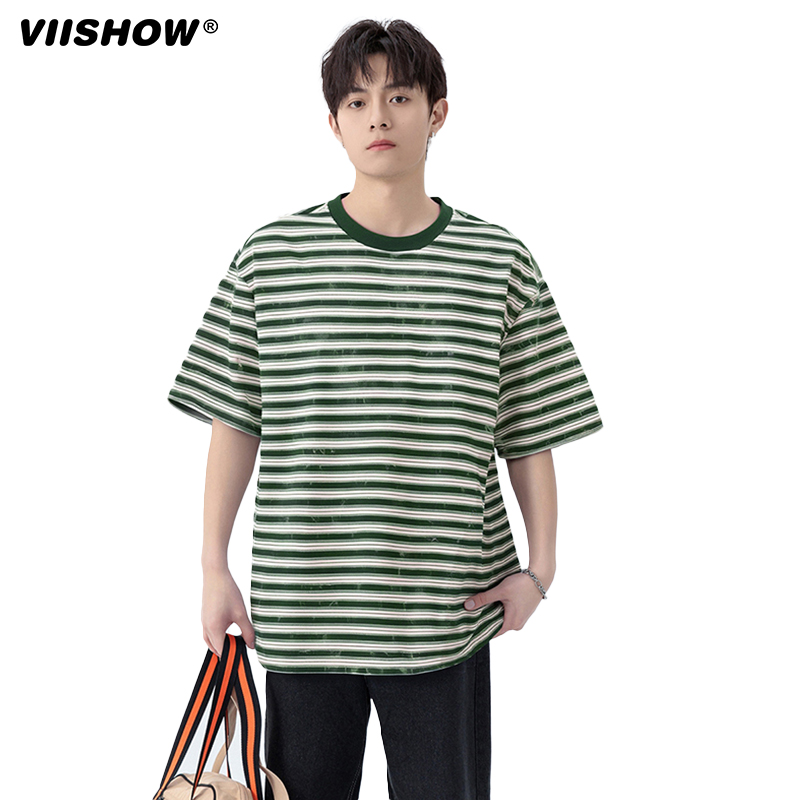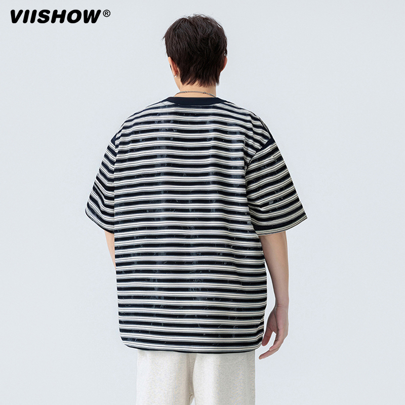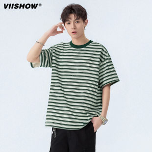 VIISHOW潮牌日系黑白条纹圆领短袖 宽松情侣百搭上衣 T恤男女夏季
