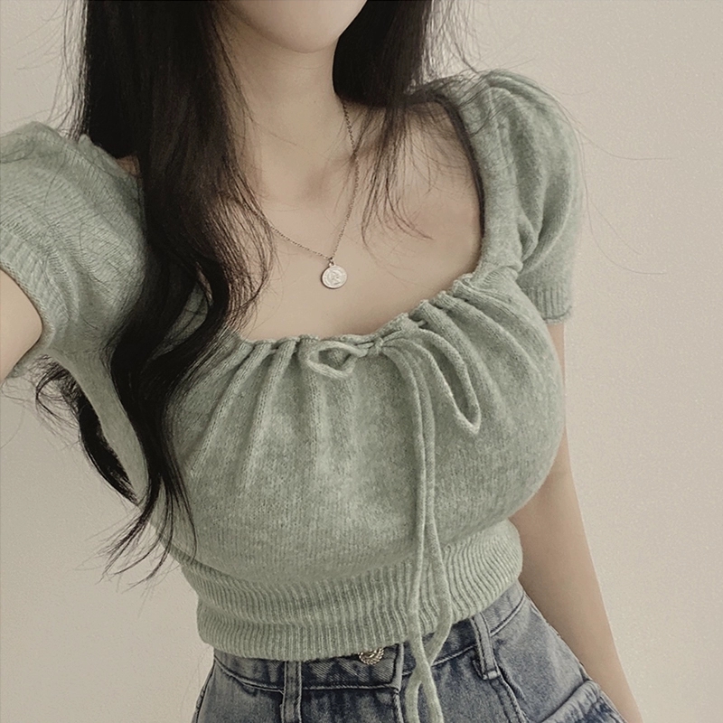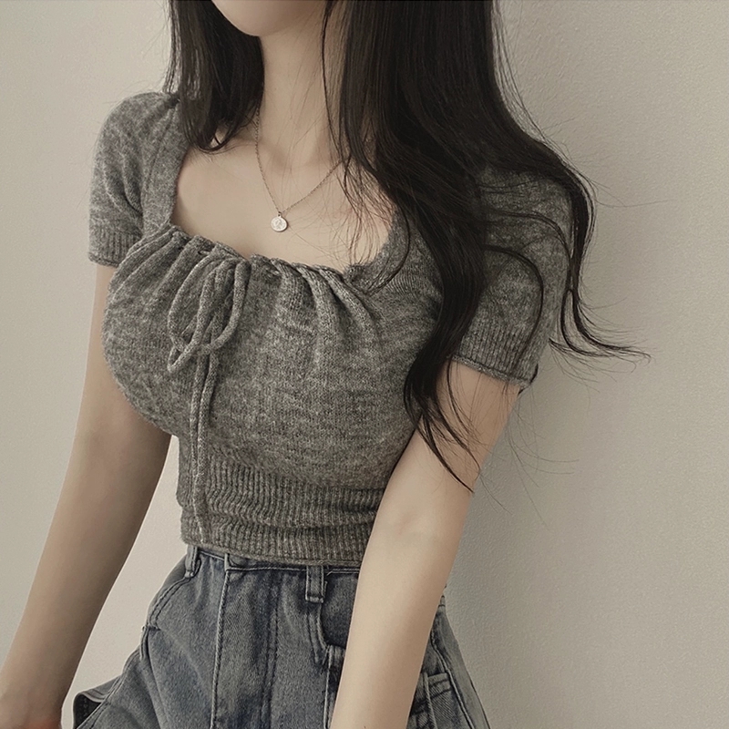 短款 法式 小个子修身 夏季 收腰辣妹针织上衣 方领正肩白色t恤女短袖