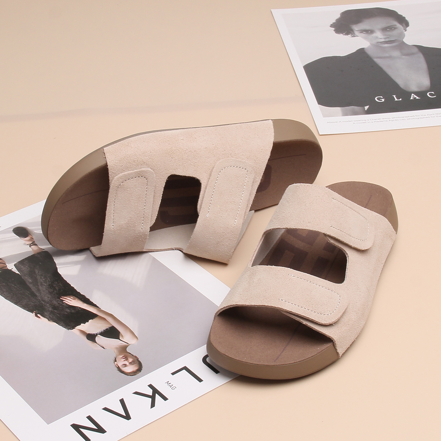 时尚 夏季 牛反皮平底魔术贴露趾2025新款 嘉俪多女欧美勃肯外穿拖鞋