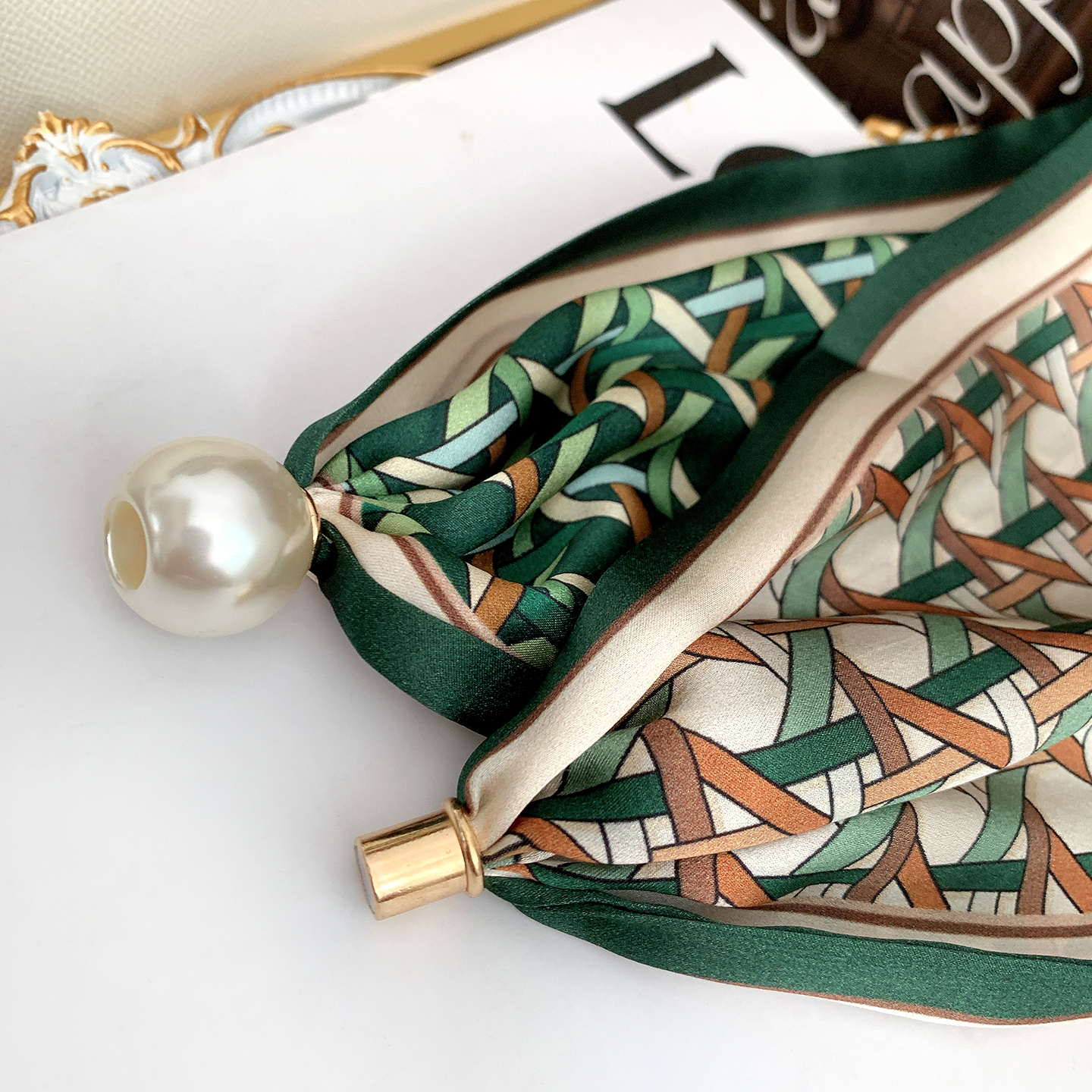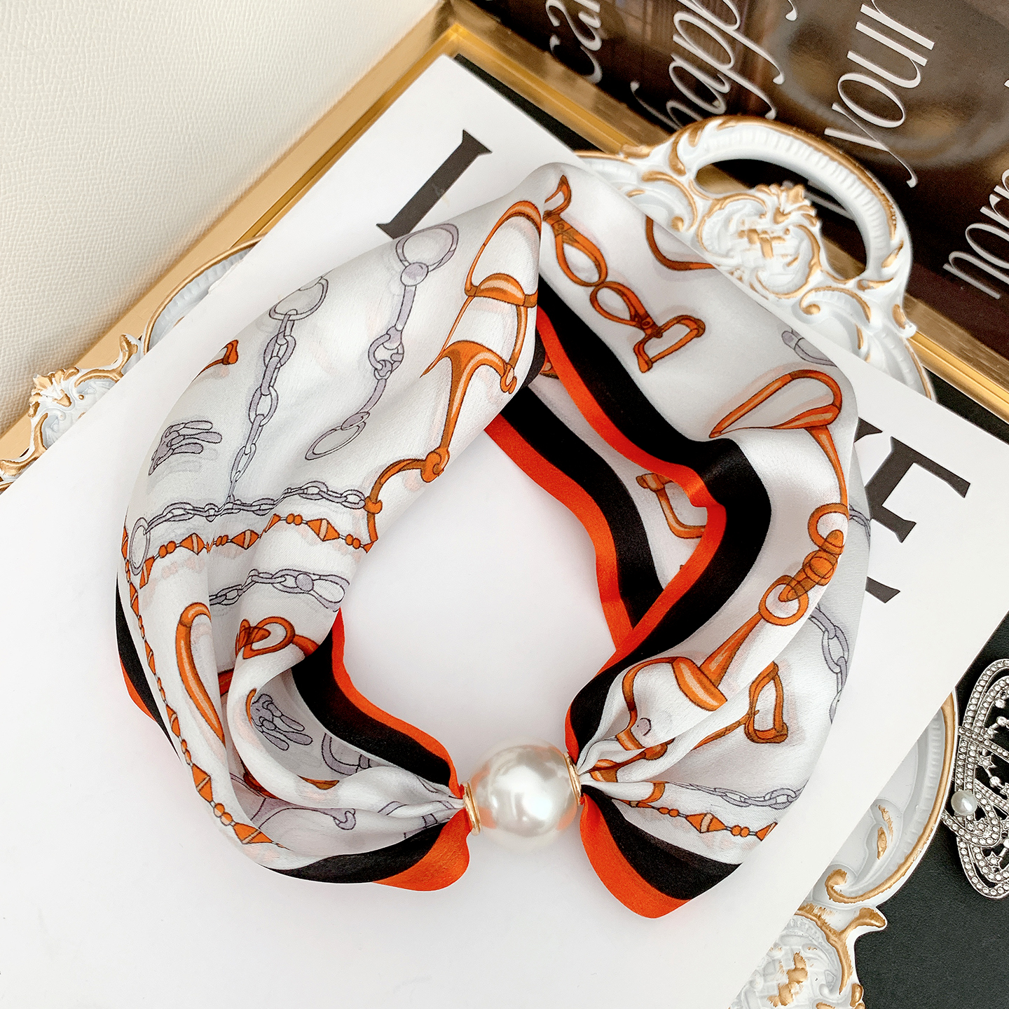 高级感珍珠磁铁扣真丝项链丝巾女围巾复古装 饰领巾护颈围脖春夏秋
