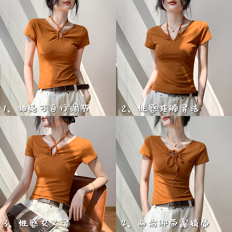 显瘦甜辣小众设计感上衣 修身 歌倍尚挂脖V领正肩短袖 T恤女2025夏季