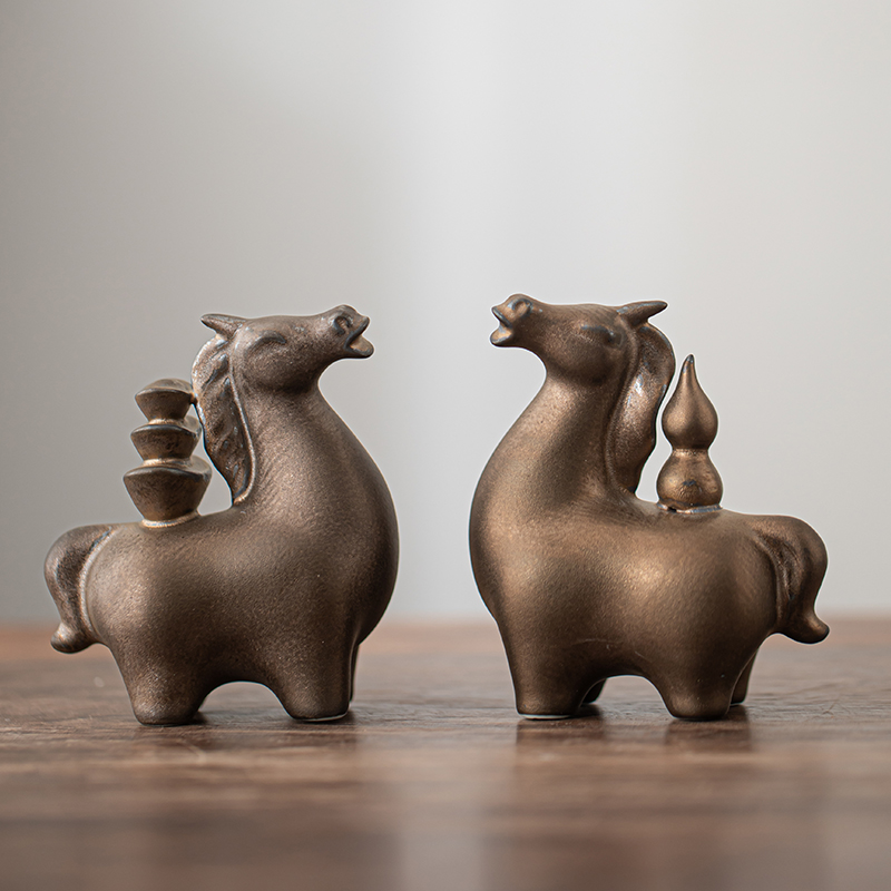 宇轩陶瓷小马茶宠摆件家居黑马饰品鎏金轻奢高档手捏花白瓷马摆件