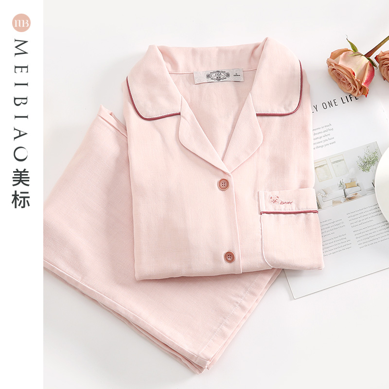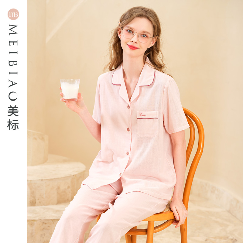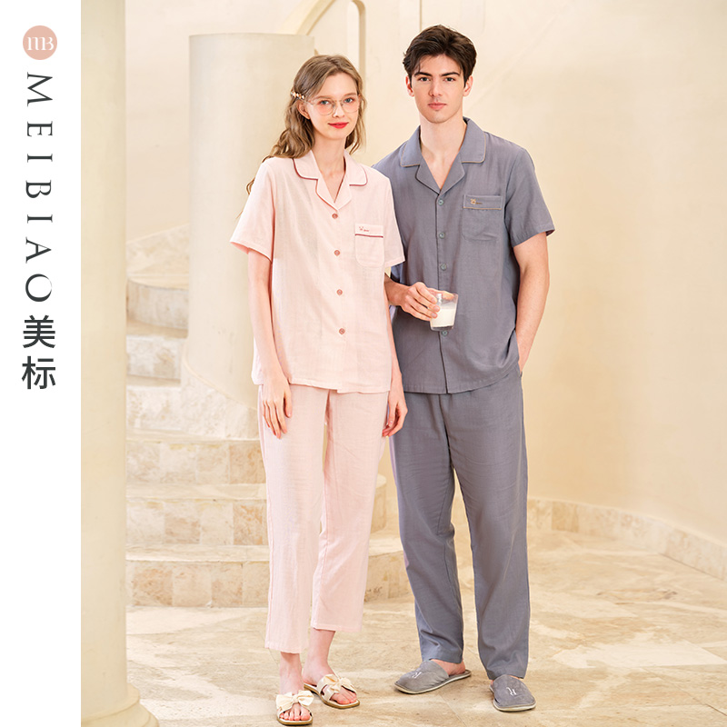 女春夏休闲全棉质双层棉纱家居服男 情侣纯棉睡衣套装 美标新款 短袖