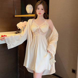 冰丝睡衣女睡袍套装 性感纯欲风薄款 丝绸带胸垫吊带睡裙长袖 春秋季