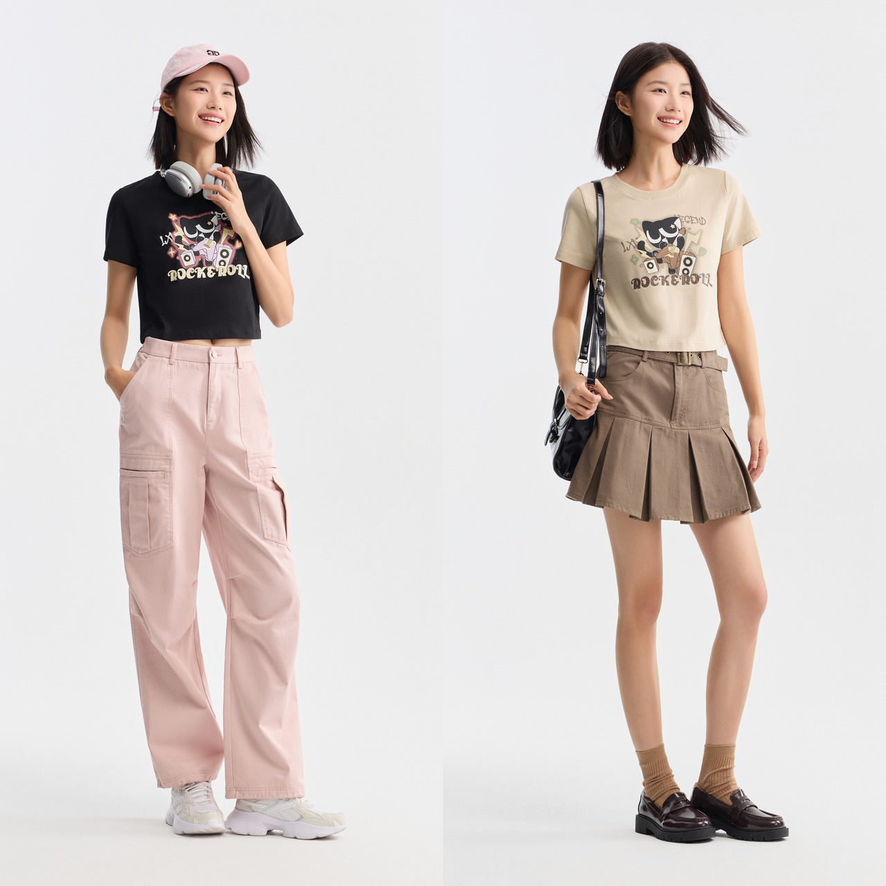复古2024夏新款 学院风美式 纯棉上衣可爱 T恤女短款 森马罗小黑短袖