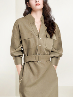 V领中长款 休闲通勤工装 连衣裙女2025年秋装 收腰修身 裙潮 新款 法式