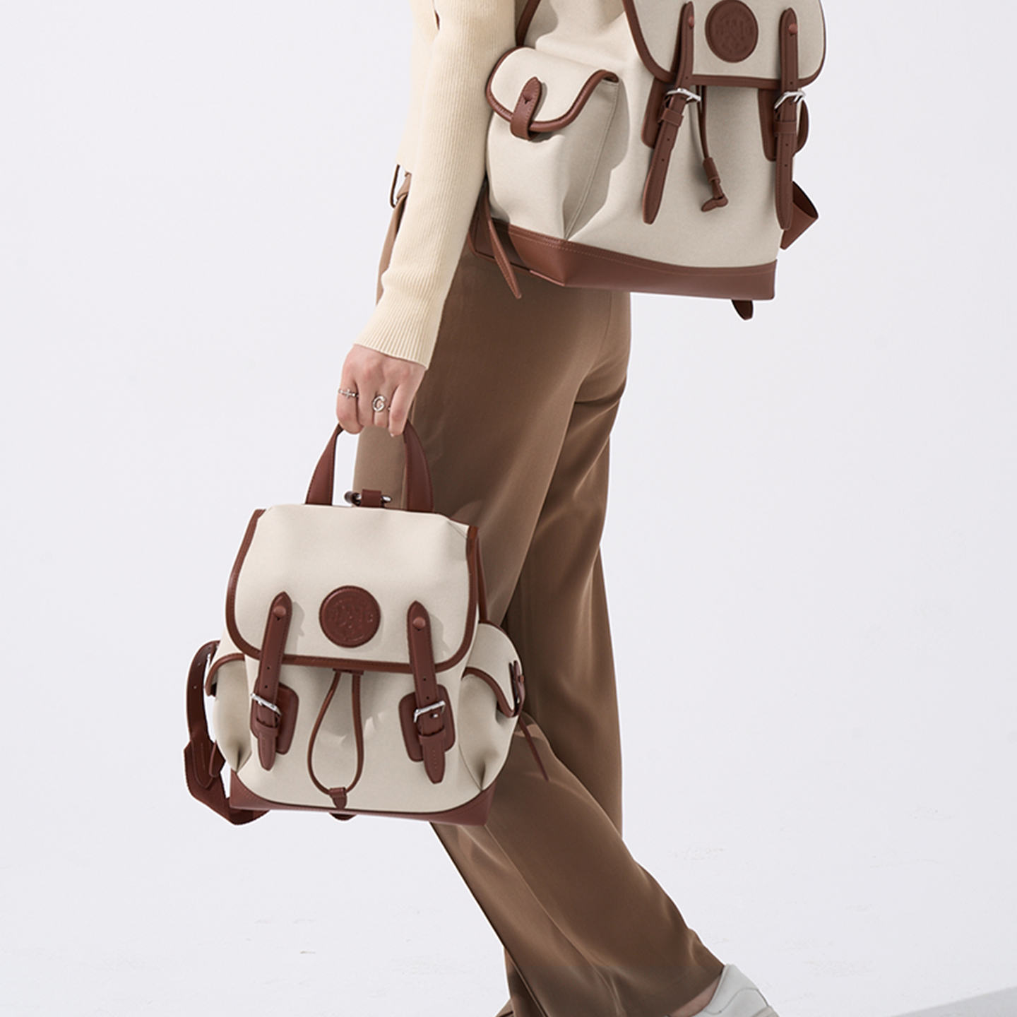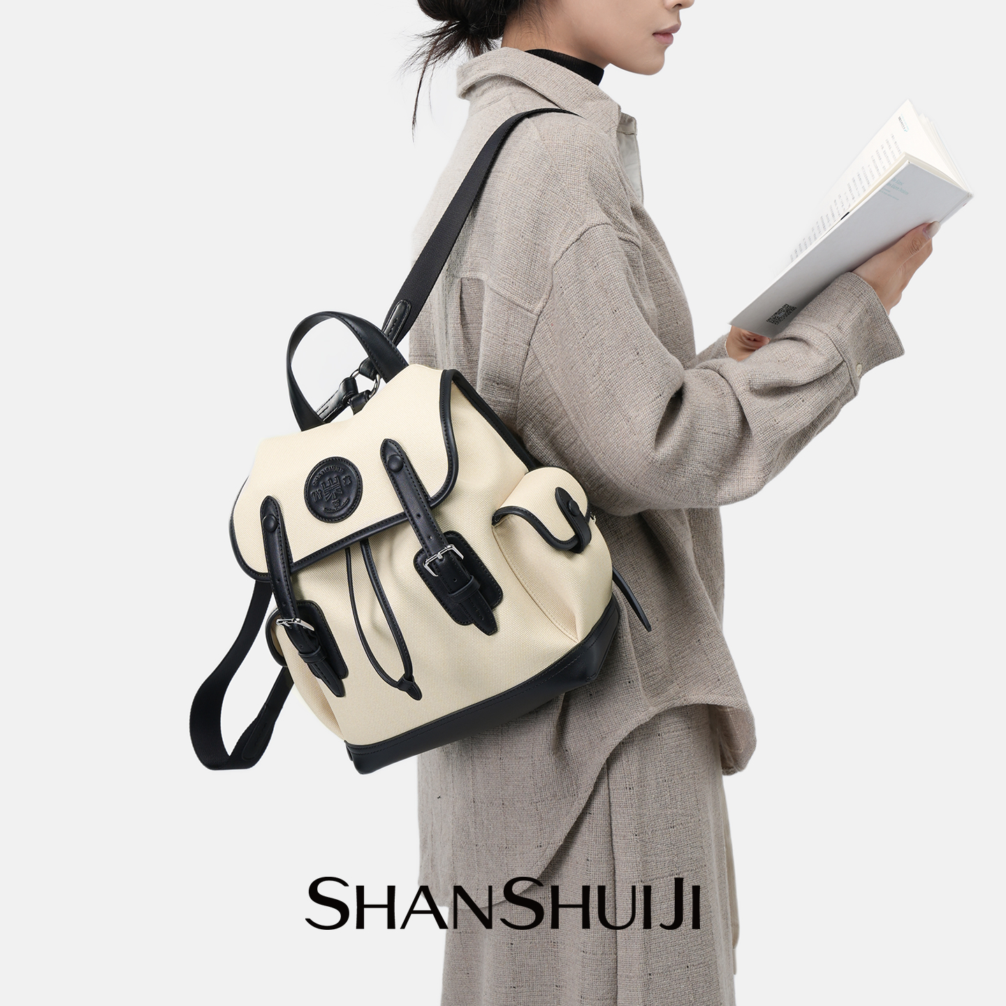 山水集新款 背包女双肩抽绳小众高级帆布包质感轻便书包通勤双肩包