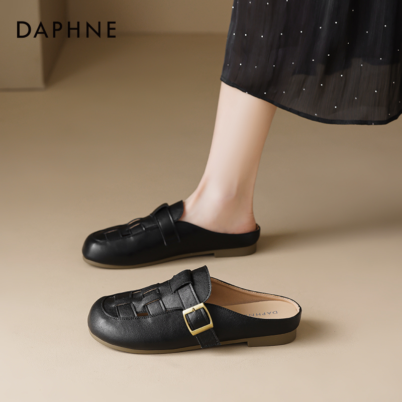 镂空粗跟一脚蹬黑色凉拖鞋 达芙妮罗马包头半拖鞋 女秋外穿2025新款