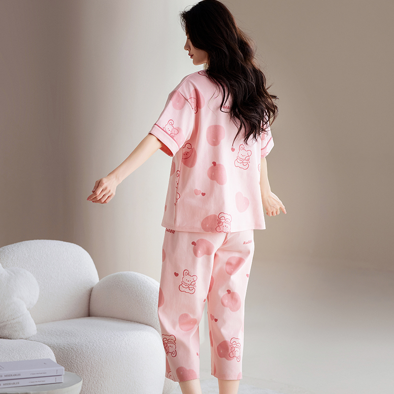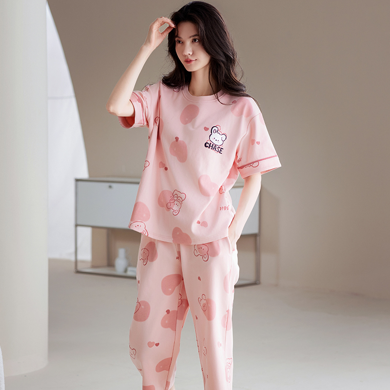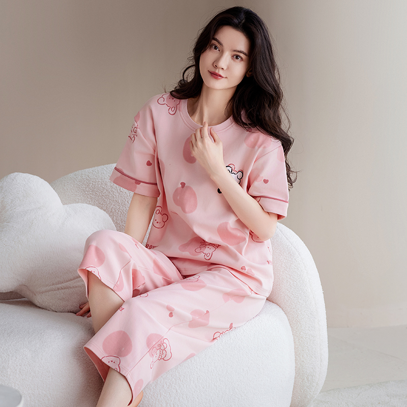 短袖 夏天家居服套装 七分裤 可爱大码 薄款 芬腾纯棉女睡衣带胸垫夏季