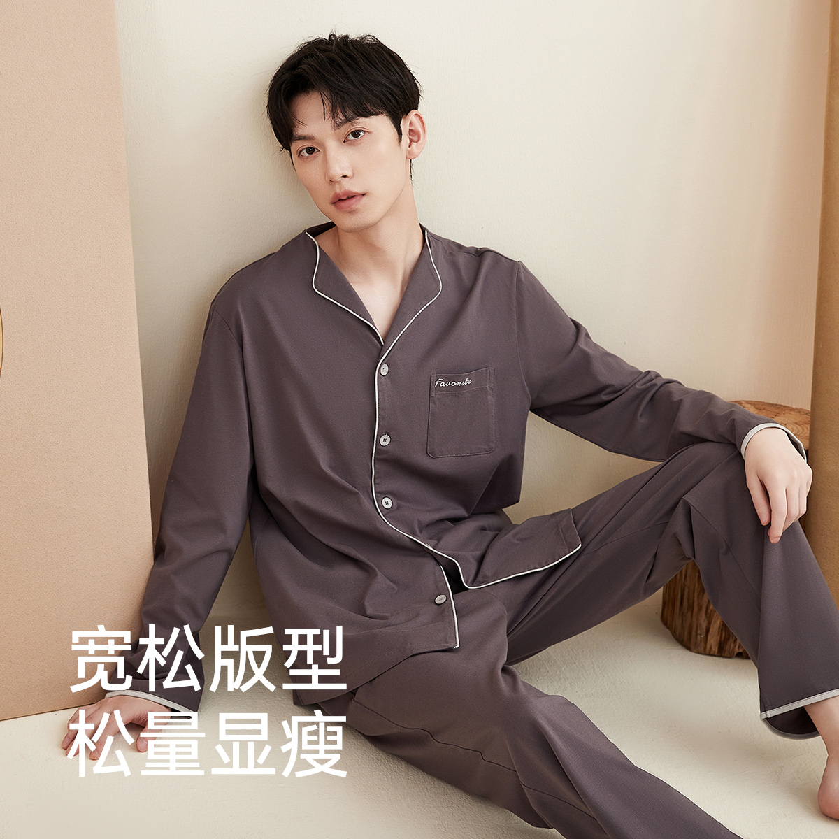 长袖 全棉时代睡衣男士 开衫 纯棉高级春秋季 翻领 水光棉家居服套装