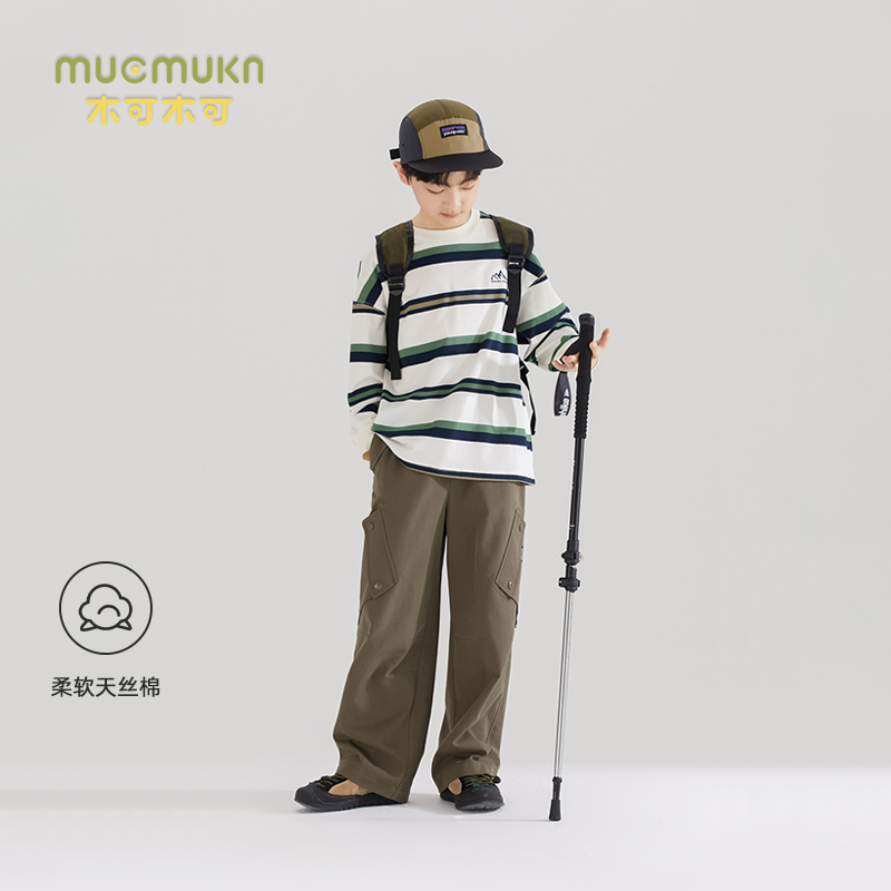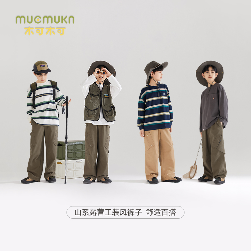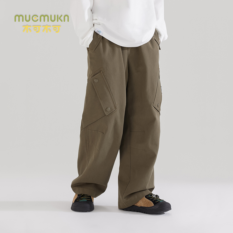 子宽松百搭军绿色潮男松紧休闲长裤 男童秋露营风大口袋工装 裤
