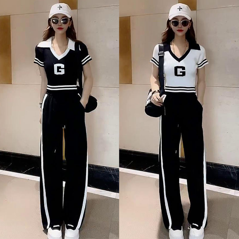 休闲运动套装 字母T撞色阔腿长裤 女夏季 V领短袖 两件套 新款 时尚