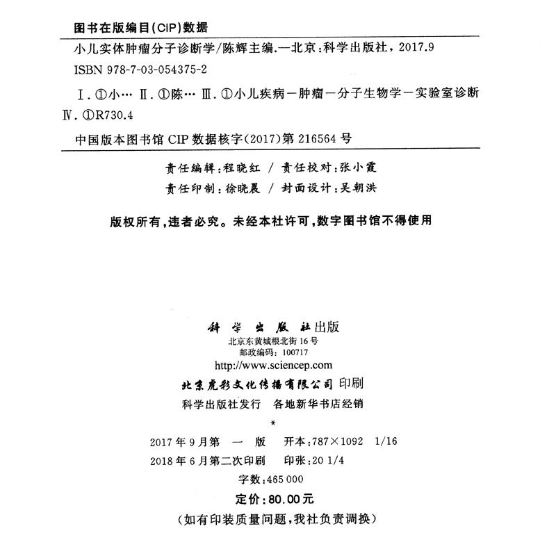 小儿实体肿瘤分子诊断治疗书籍 9787030543752 小儿实体肿瘤分子诊断学 陈辉