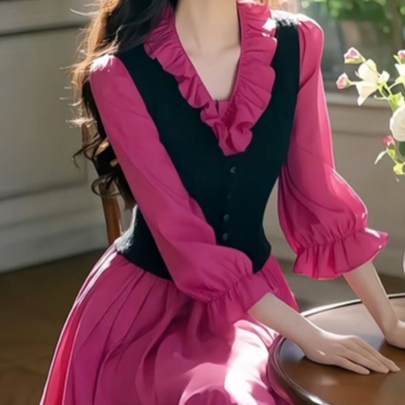2025新款 连衣裙 富家千金穿搭假两件气质名媛高端玫红色木耳边衬衫